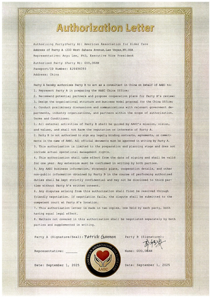 American Association for Elder Care(AAEC,美国老人护理协会) 是一家在美国正式登记注册的 501(c)(3) 公益性非营利组织,总部位于美国内华达州,长期致力于推动美国老龄社会的政策创新、服务体系优化与国际交流合作。协会以建设 高质量、可持续、韧性(Resilient)的 老人护理生态 为核心使命,已发展成为美国老龄服务领域内具有国际影响力的行业平台。AAEC 以“为老年人提供更加安全、高效、可及的照护”为宗旨,通过政策研究、行业数据积累、服务生态建设与跨境合作,连接政府机构、养老机构、科技企业、研究机构等多方主体,为美国及国际合作伙伴提供专业化的老龄服务支持。